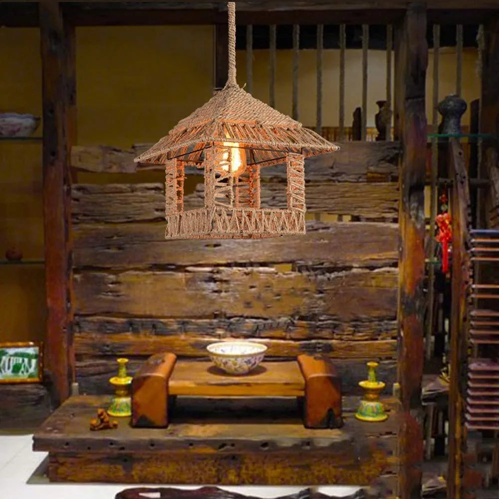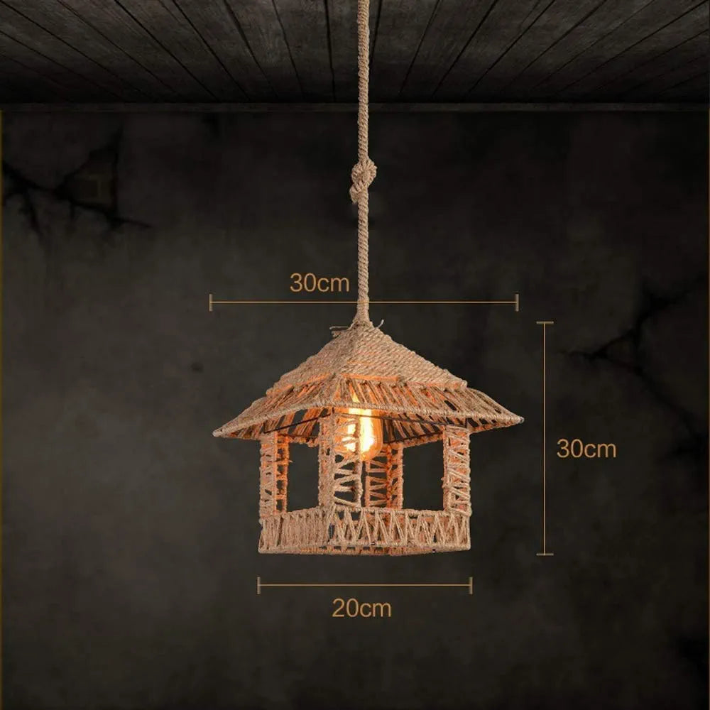 Add character to your space with this vintage-inspired pendant light, featuring a sturdy iron house-shaped frame wrapped in flexible hemp rope. The bendable rope allows for a customizable look, making it a unique statement piece.