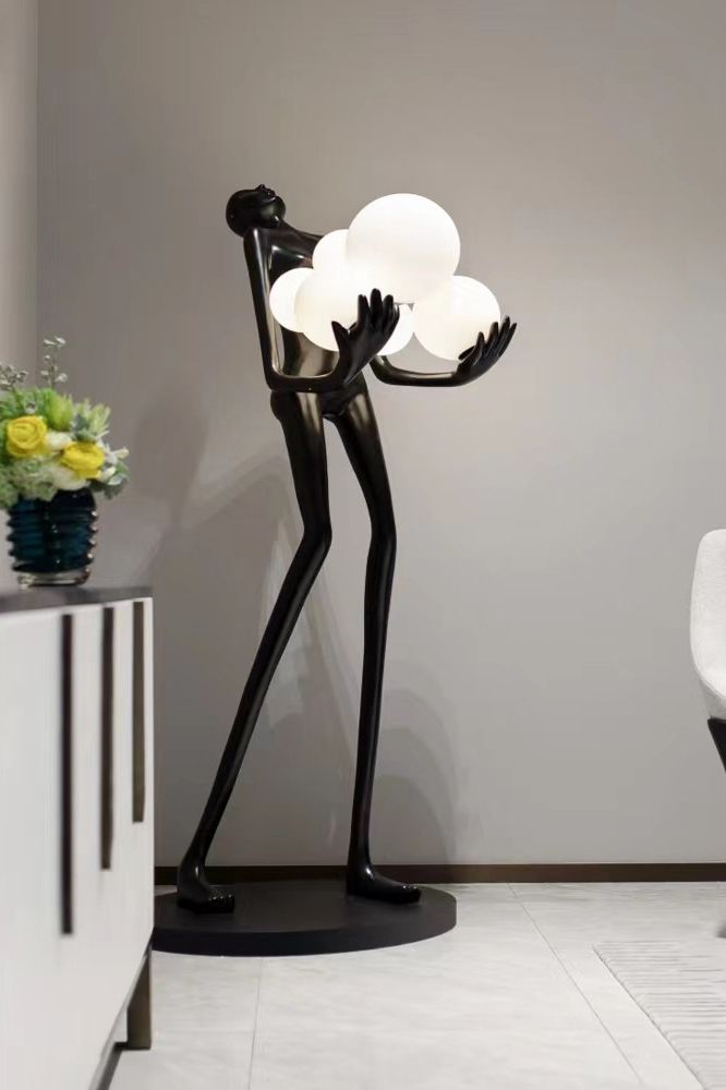 Turn your space into a modern gallery with the GlowBearer Sculpture Floor Lamp β a bold fusion of artistic form and soft illumination. Crafted from durable black resin, this humanoid figure stands tall and expressive, holding glowing orbs that mimic moons or dreams caught in hand.